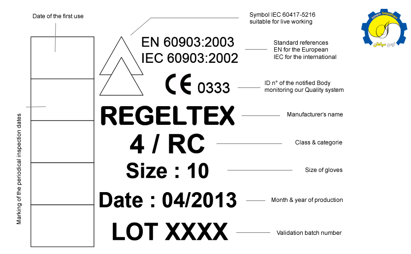 علائم و نماد های مشخص شده بر روی دستکش عایق برق نرمال رجلتکس Regeltex