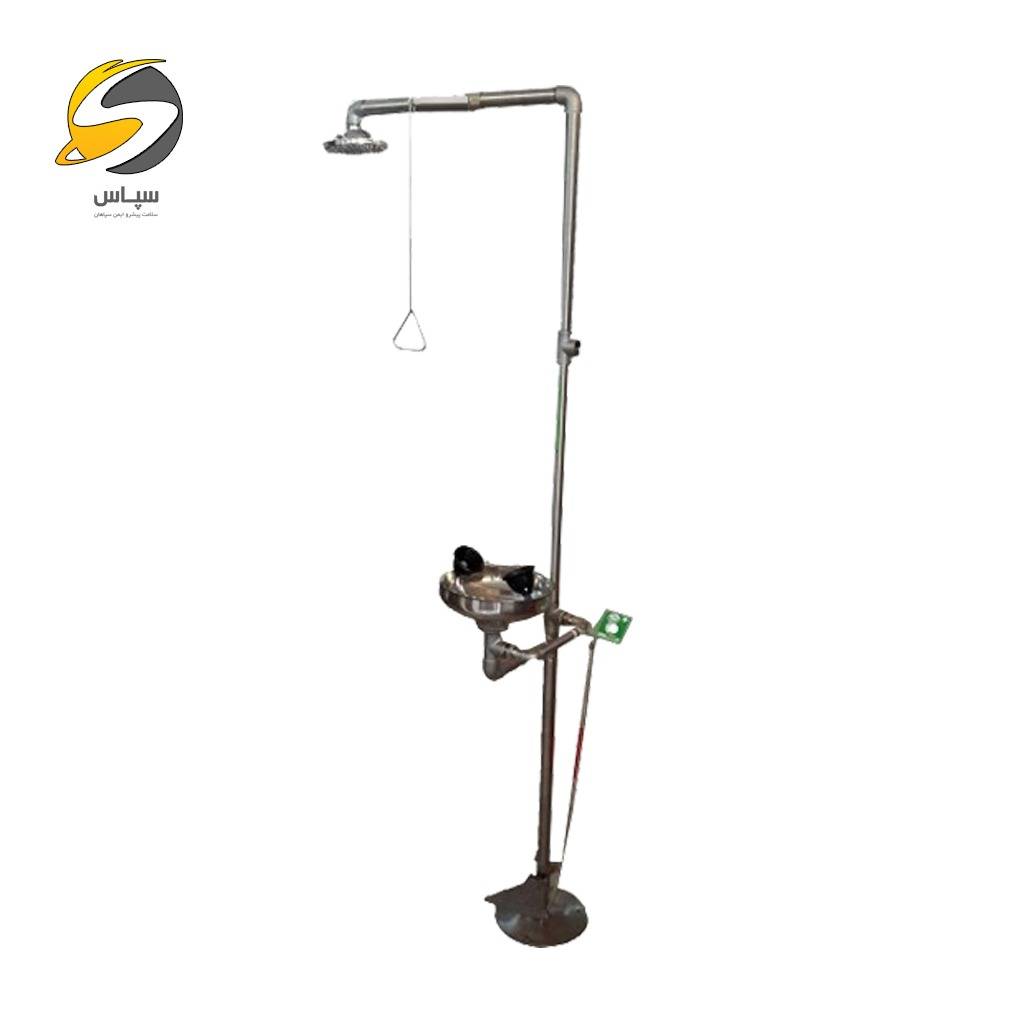 دوش و چشم شوی اضطراری استیل قابل نصب بر روی زمین و ورودی آب بر روی دیوار می باشد که لوله ها، کاسه و پدال تماما از استیل 304 و اتصالات آن از استیل 316 ساخته شده اند. چشم شوی استیل ایستاده به وسیله دو اهرم متصل به زنجیر دستی و پدال پایی عمل می کتد. دوش اضطراری با زنجیر دستی عمل نموده و آب ناشی از آن تمام بدن را فرا می گیرد. چشم شوی متصل به دوش استیل دارای دو نازل آب پاش مجهز به حفاظ چشمی لاستیکی است که در ظرف سر ریز آب قرار گرفته اند و به وسیله اهرم دستی یا پدال پایی شروع به پاشش آب می کنند. دوش و چشم شوی اضطراری استیل مطابق استاندارد و ظرفیت آب حدودا 20 لیتر در دقیقه با فشار 15 پوند بر اینچ مربع از طریق یک لوله به قطر 1 اینچ و طول 450 میلیمتر خروجی دارد. این دوش هم به وسیله اهرم متصل به زنجیر دستی و هم به وسیله پدال پایی بطور اتوماتیک عمل نموده و در یک لحظه آب تمام بدن را فرا می گیرد.