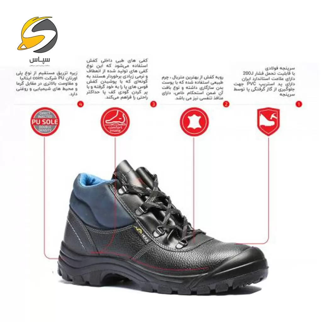 پوتین ایمنی یحیی مدل Hera ساقدار با رویه چرم طبیعی سازگار با پوست، کفی داخلی مموری فوم طبی، سرپنجه فولادی با قابلیت تحمل فشار 200J که دارای پد استریپ PVC جهت جلوگیری از گاز گرفتگی پا توسط سرپنجه می باشد.